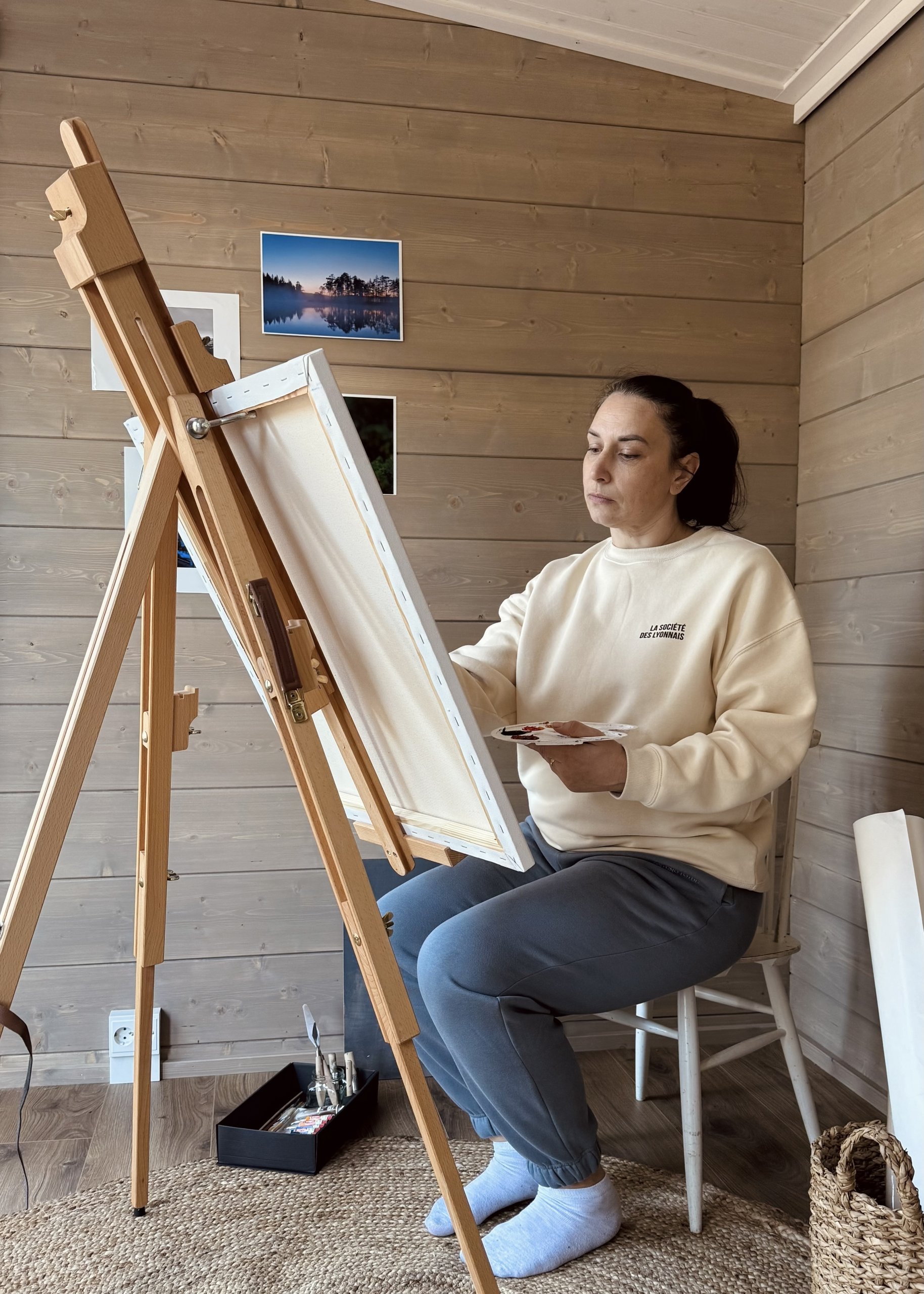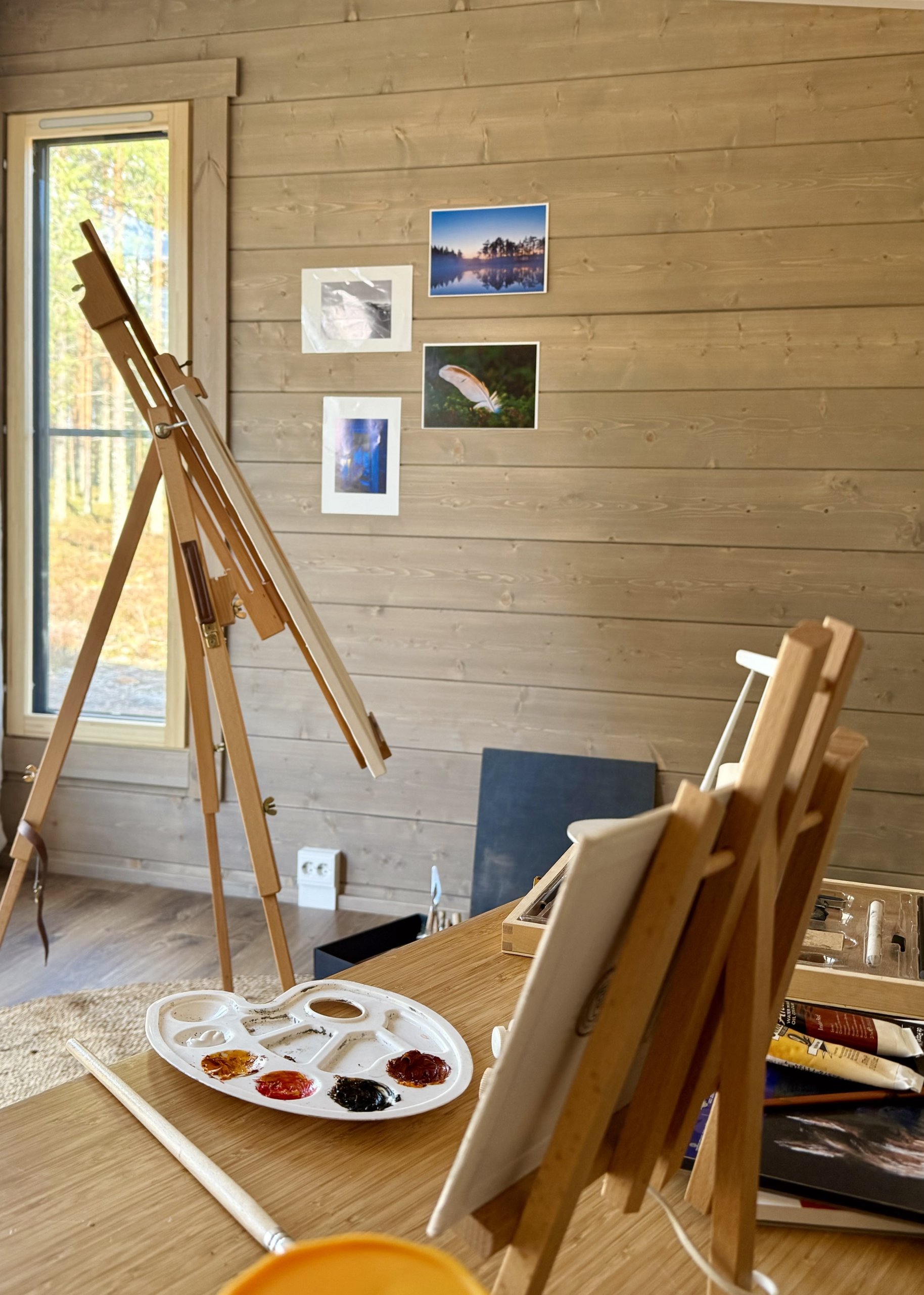 Salvoksen hirsinen piha-aitta tarjoaa rauhallisen ja inspiroivan ympäristön taiteen tekemiseen. Hirsiseinien lämpö, luonnonvalo ja puun tuoksu luovat tilan, jossa on helppo keskittyä ja antaa ideoiden syntyä.