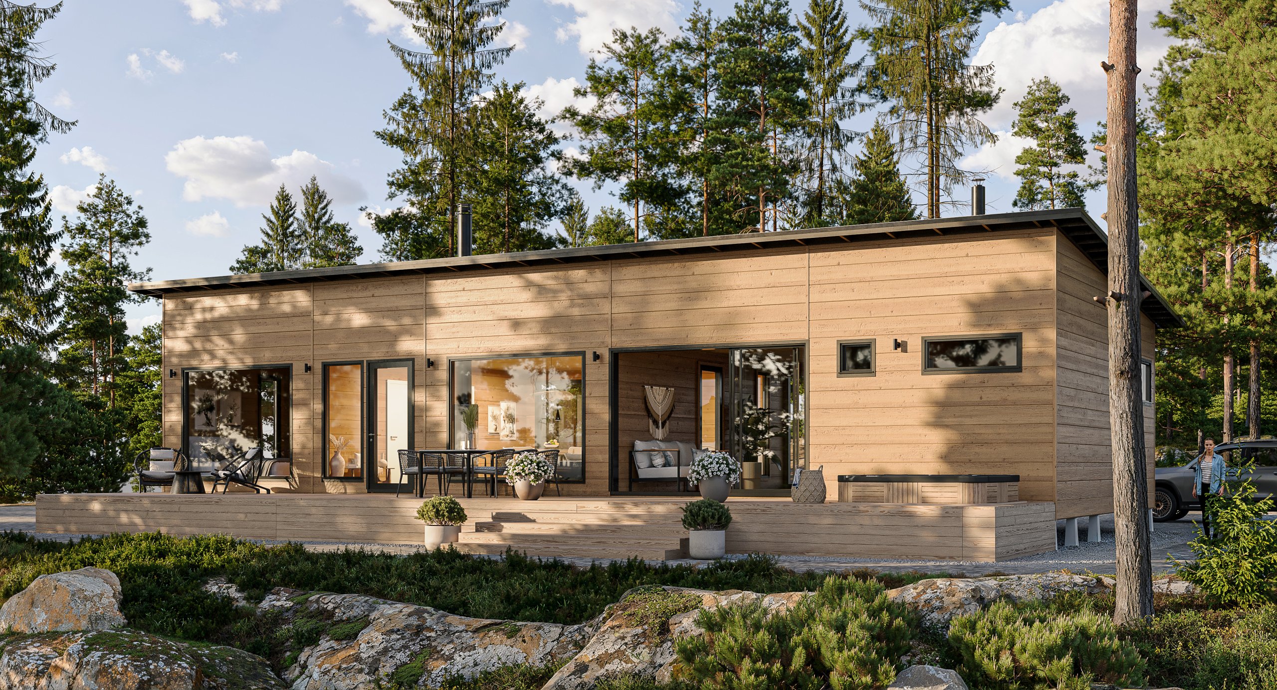 Tältä näyttää onnistunut mökkiprojekti. Ei rakennuspölyä tai keskeneräisiä listoja – aamulla vain asennus ja iltapäivällä terassikahvit.