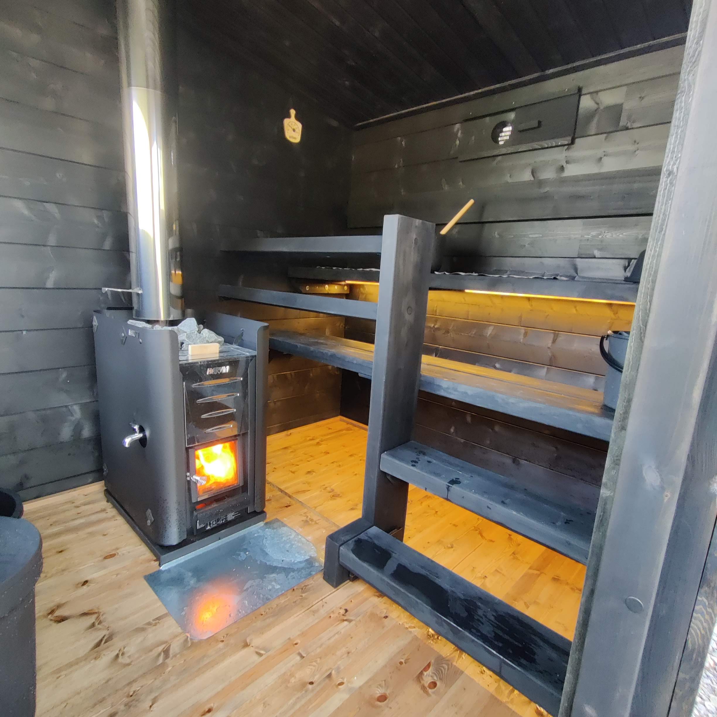Ensimmäiset löylyt tuliterässä saunassa otettiin uudenvuoden kunniaksi ja talven mittaan saunomiskertoja on ollut jo useita. Tunnelmat uudessa saunatuvassa ovat Pirjon sanoin olleet ihan huikeat.