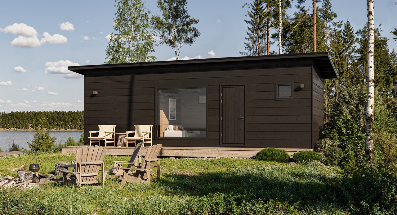 Aava perustuu selkeään ja tehokkaaseen pohjaan, jossa majoitustila ja makuuhuone muodostavat toimivan kokonaisuuden. Tupa tarjoaa tilan oleskeluun ja majoittumiseen, ja erillinen makuuhuone lisää yksityisyyttä, mikä palvelee hyvin myös perhemajoitusta. Kompakteihin neliöihin on tiivistetty kaikki tarvittava: rauhallinen nukkumisalue, WC sekä käytännöllinen sisäänkäynti, joka helpottaa huolto- ja siivoustyötä.
