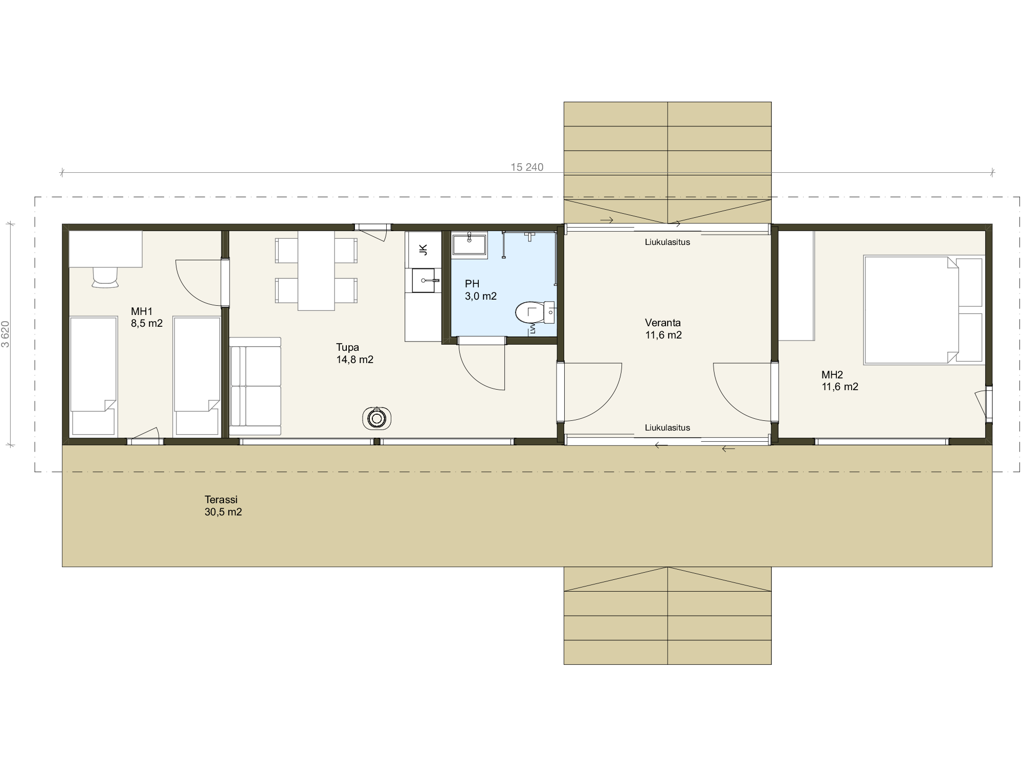 Lasitettu veranta tuo valoa ja avaruutta mökkiin, samalla kun se tarjoaa suojaisan tilan, jossa voit nauttia ympäröivästä luonnosta kaikissa sääolosuhteissa. Iso terassi kutsuu ulkoiluun ja rentoutumiseen, olipa kyseessä aamiaisen nauttiminen auringossa tai illallisen viettäminen tähtitaivaan alla.