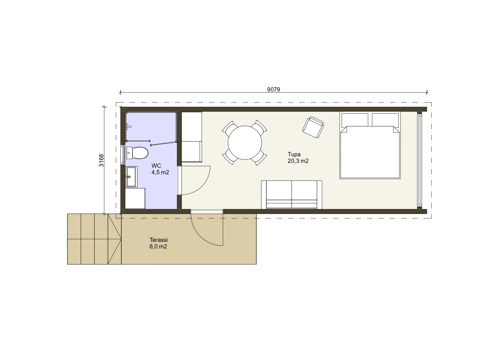 Pohjaratkaisu on erityisen sopiva leirintäalueille ja majoituskylille, joissa halutaan tiivis mutta ilmava kokonaisuus. Sisäänkäynnin edessä oleva katettu alue tuo suojaa ja selkeyttää kulkua. Rakennus toimii ympärivuotisesti ilman, että rakenne vaatii majoitusyrittäjältä erityistoimia vuodenajan mukaan.
