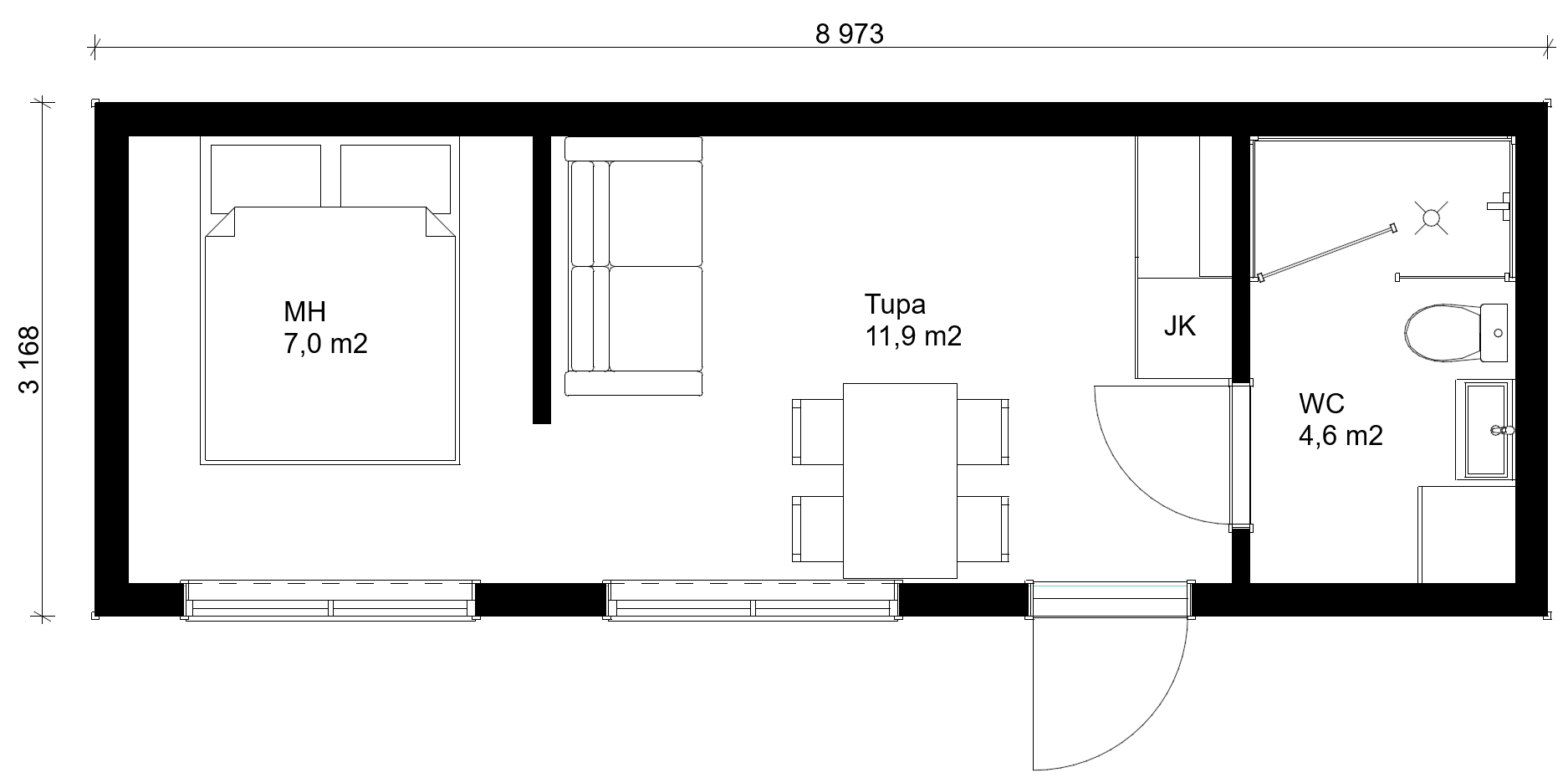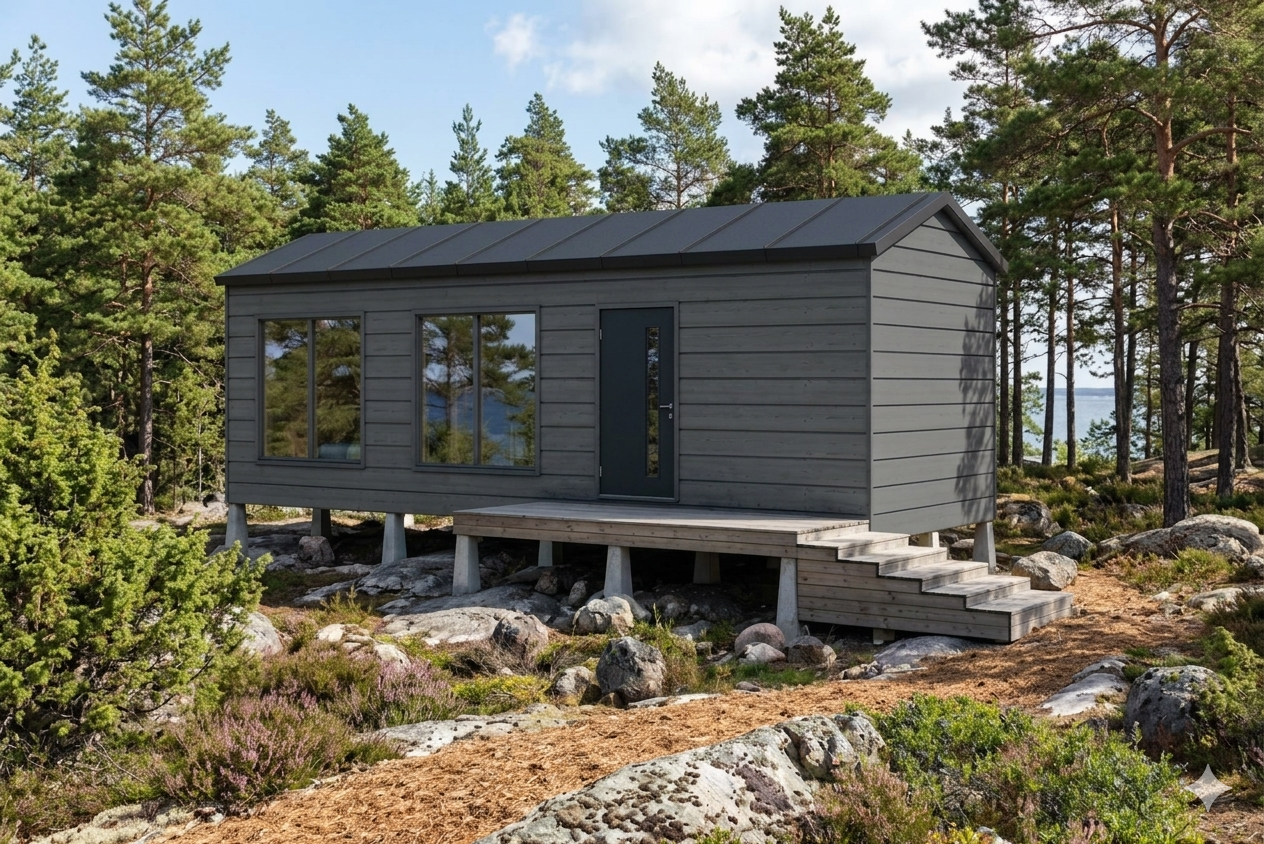 Veisto 29 mallista on saatavilla myös tämä harjakattoinen malli, joka istuu luontevasti jylhiin maisemiin. Suuret pystypuitteiset maisemaikkunat kehystävät ympäröivän luonnon osaksi sisätilaa ja tuovat tilaan runsaasti valoa. Kompakti ja toimiva pohjaratkaisu tarjoaa mukavan majoituksen 2-4 henkilölle.
