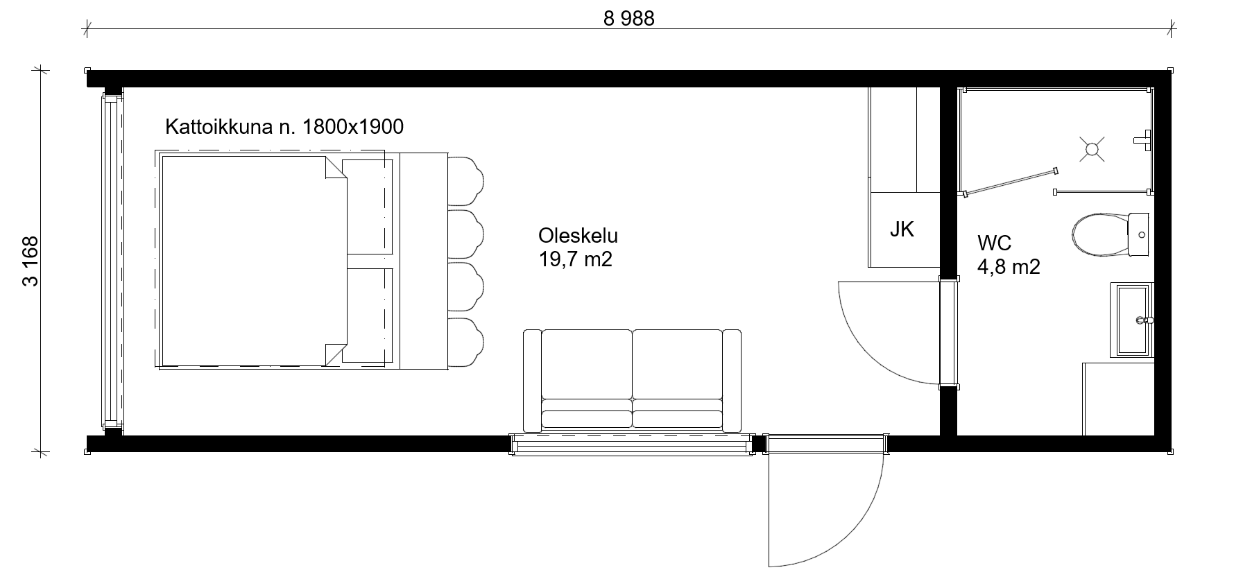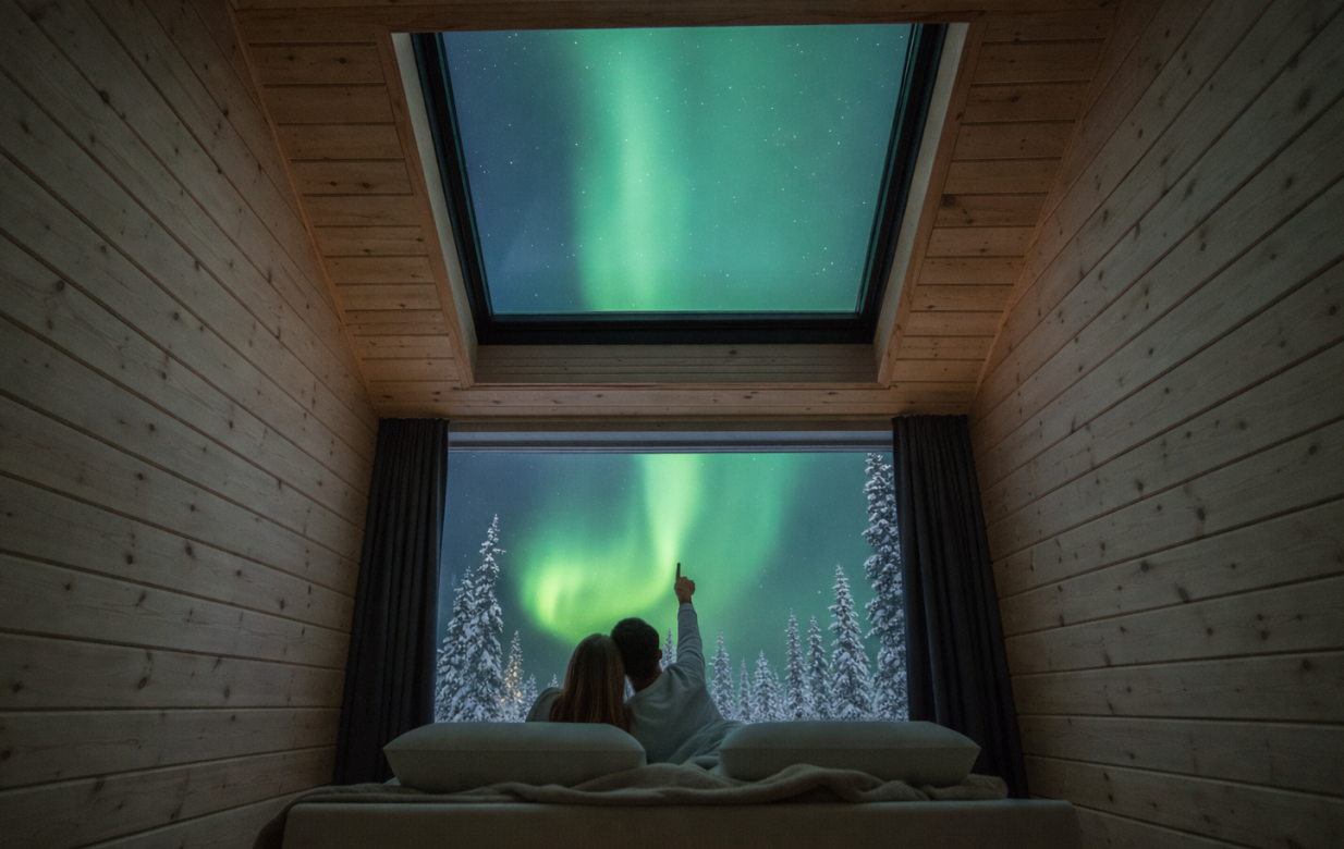 Pallas 28 on näyttävä hirsimökki, jonka epäsymmetrinen harjakatto tuo arkkitehtonista ryhtiä ja ilmettä lomakylä-kokonaisuuteen. Koko seinän korkuinen maisemaikkuna avaa näkymän suoraan ympäröivään luontoon ja tuo maiseman osaksi sisätilaa. Tähän malliin on saatavilla kattoikkuna, jonka lämmitettävä lasi varmistaa esteettömän näkymän taivaalle ympäri vuoden.