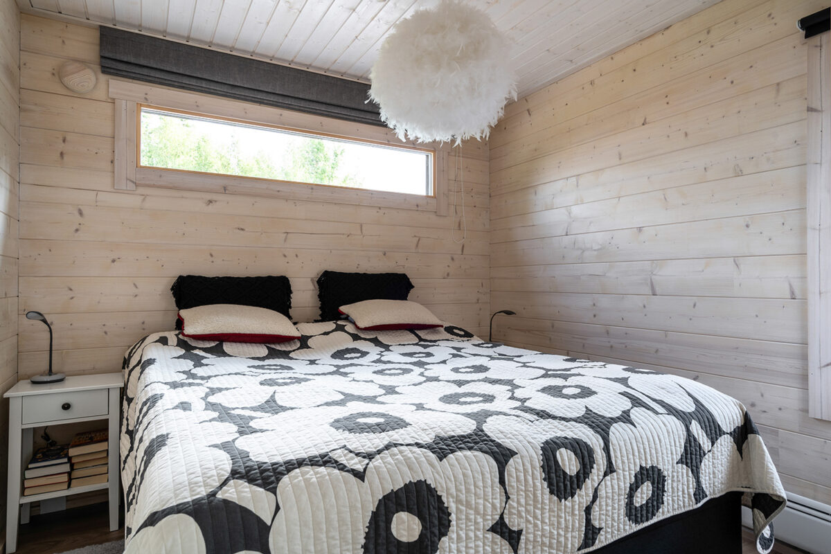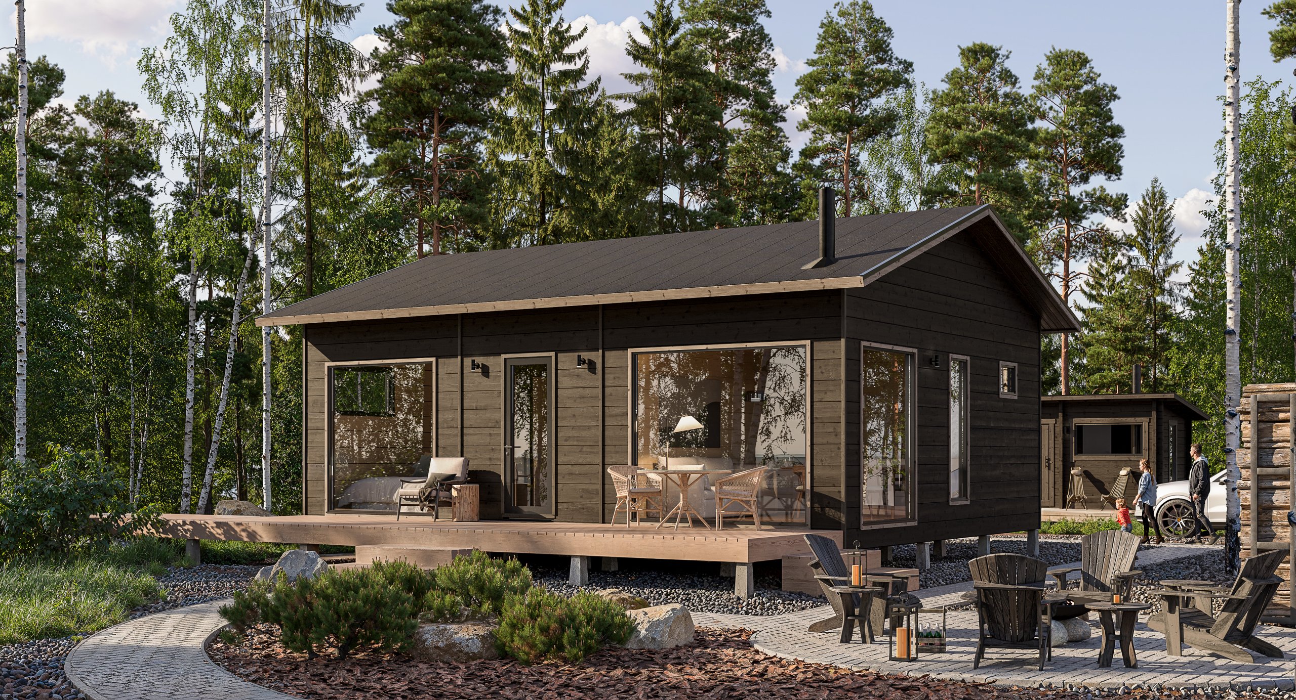 Voit korostaa mökin modernia ilmettä valitsemalla suuret, näyttävät ikkunat, jotka tuovat runsaasti luonnonvaloa sisätiloihin.