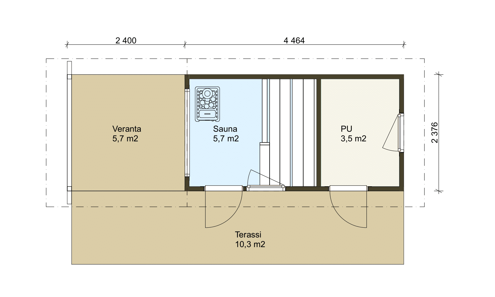 Veisto 11B on kompakti saunarakennus, jossa yhdistyvät toimivuus ja tyylikkyys. Sauna ja pukuhuone muodostavat käytännöllisen kokonaisuuden, jota täydentää näyttävä katettu veranta. Tässä mallissa sauna ja pukuhuone ovat peräkkäin, mikä sopii erityisen hyvin tilanteisiin, joissa rakennuspaikan tila on rajallinen sivusuunnassa. Jos julkisivu avautuu eteenpäin mutta tilaa on enemmän rakennuksen takana, pukuhuone sijoittuu kätevästi saunan taakse oikean tai vasemman sijaan. Lisäksi etupuolelle on mahdollista toteuttaa oleskelutila, joka lisää käytännöllisyyttä ja viihtyvyyttä.