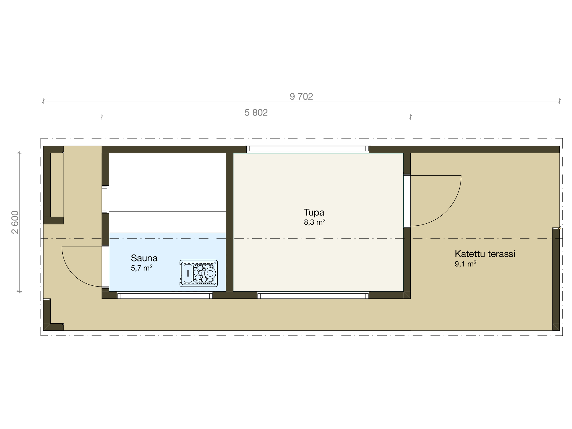 Tässä mallissa on tilava tupa, joka tarjoaa mukautuvan ja monikäyttöisen tilan. Katettu terassi lisää tilan käytettävyyttä, mahdollistaen ulkona oleilun kaikissa sääolosuhteissa. Suuret ikkunat päästävät runsaasti luonnonvaloa sisään ja tarjoavat kauniit näkymät ympäröivään maisemaan, mikä korostaa saunan rauhoittavaa tunnelmaa.