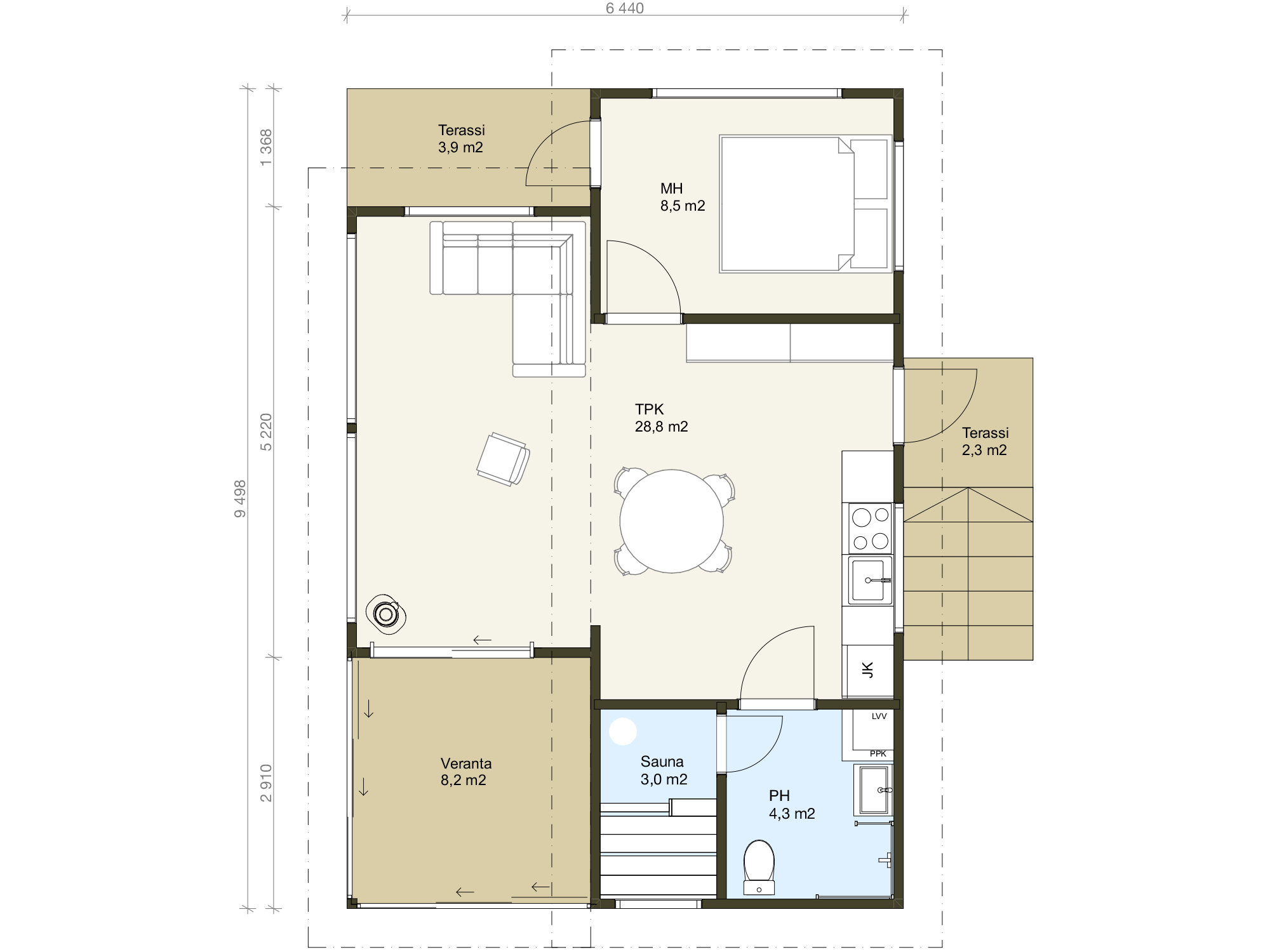 Mökissä on yksi mukava makuuhuone, joka tarjoaa rauhallisen ja mukautuvan nukkumistilan. Moderni sauna kutsuu sinua rentoutumaan ja nauttimaan lämmöstä pitkän päivän jälkeen.